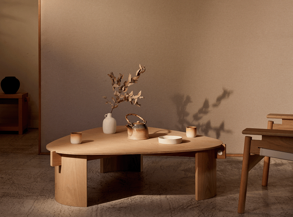 Flow Coffee Table is a refined interpretation of Chabudai, the traditional Japanese low table. It is flatpack, and the pieces slot together easily with the system similar to the traditional Japanese woodcraft technique Jigoku-Gumi.