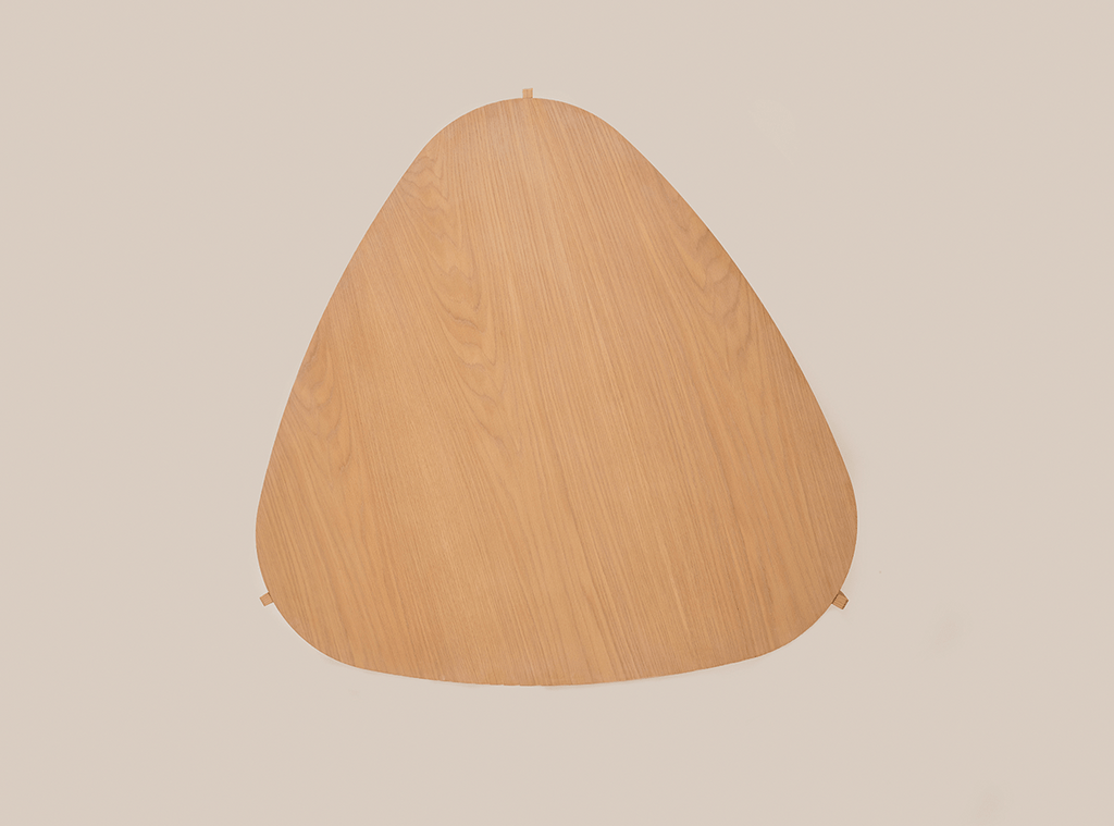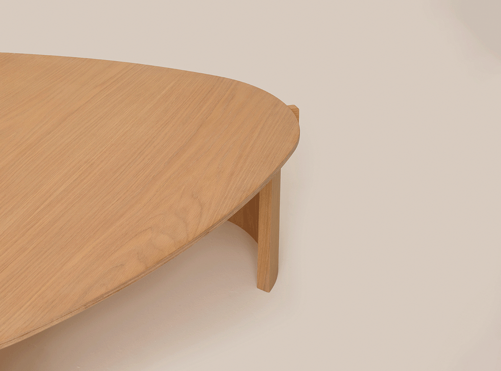 The triangular Flow Coffee Table Large with rounded edges, contours its form by curved three legs. With the interlocking linear laths, the sculptural skeleton joins into the legs to create a well-proportioned base for the table top.