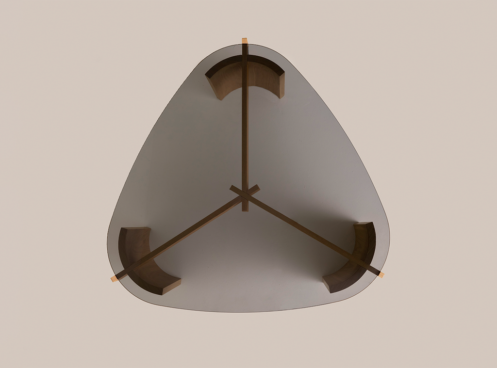 The triangular Flow Coffee Table Large with rounded edges, contours its form by curved three legs. With the interlocking linear laths, the sculptural skeleton joins into the legs to create a well-proportioned base for the table top.