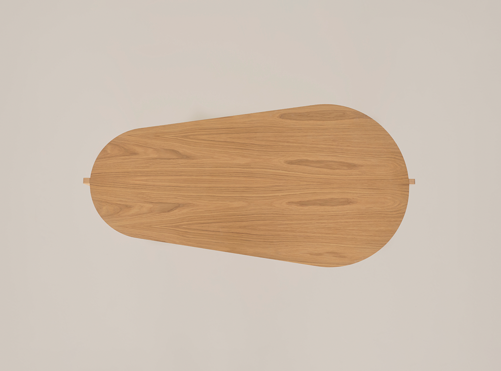 Flow Coffee Table Medium aka Japanese coffee table with rounded edges, contours its asymmetrical elliptical form by curved two legs. The linear skeleton joins into the legs to create a well-proportioned base for the table top.