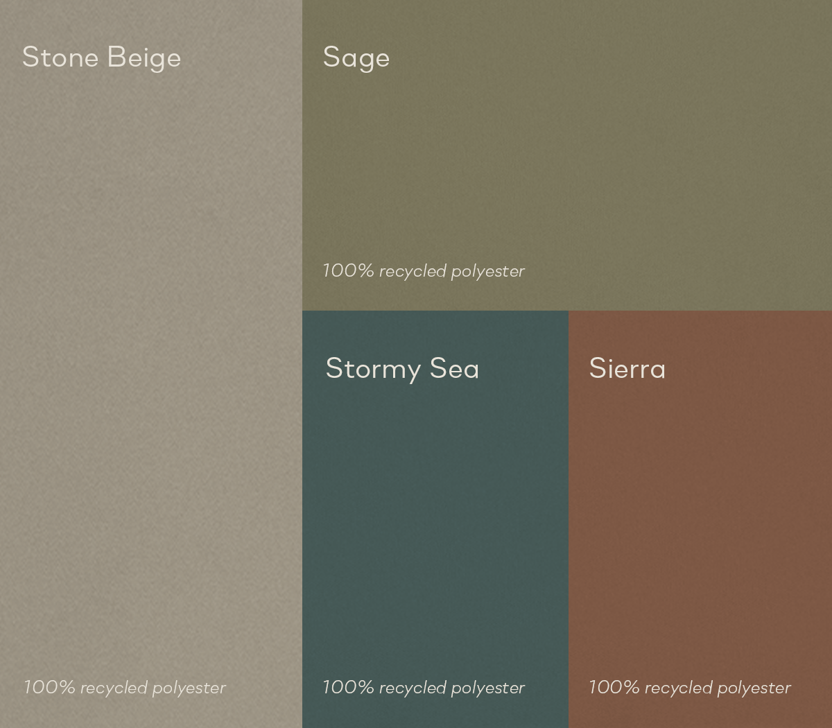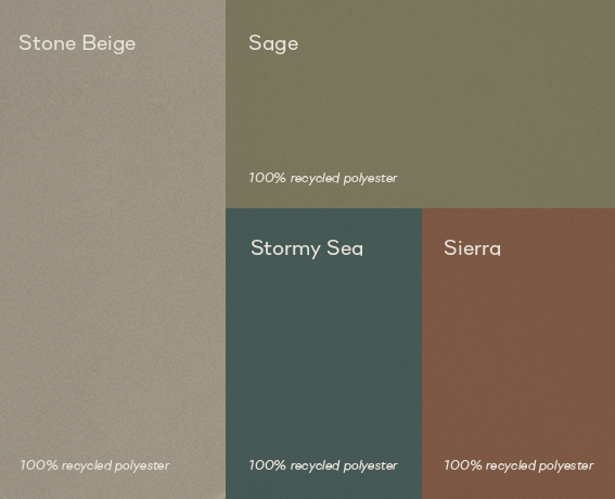 With an eco-friendly approach, the fabric is made with 100% recycled polyester. Antibacterial and easy to clean; but better yet the fabric is fire retardant.