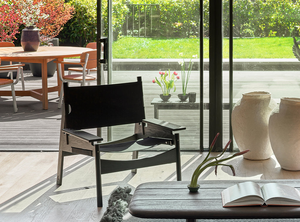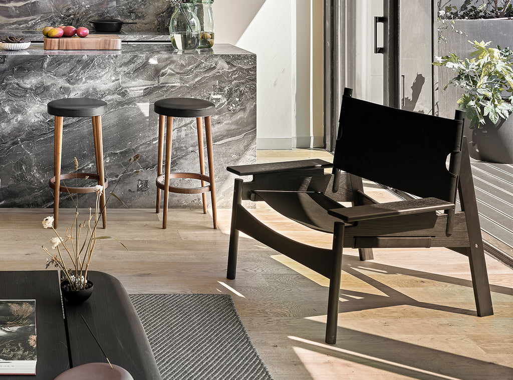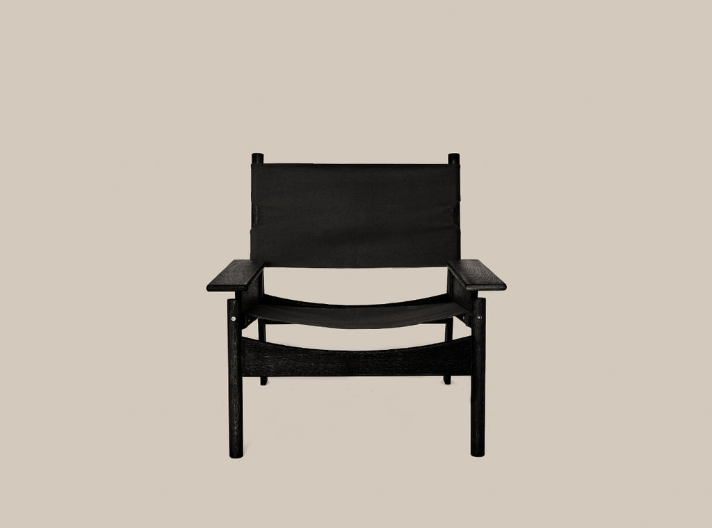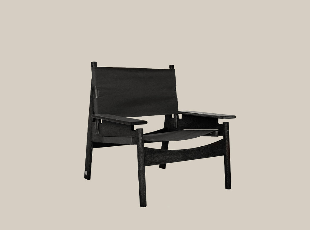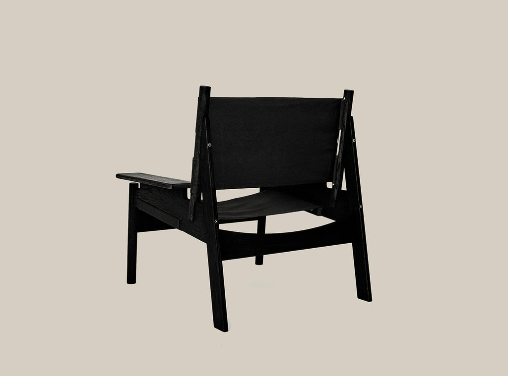 Frame Lounge Chair makes the sculptural relationship of the parts visible. The warm canvas fabrics of the seat and backrest surround the wooden skeleton with clever details.