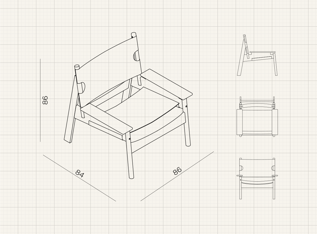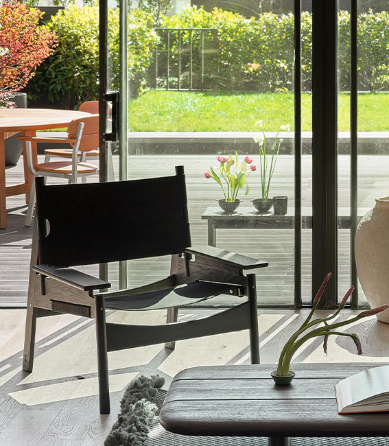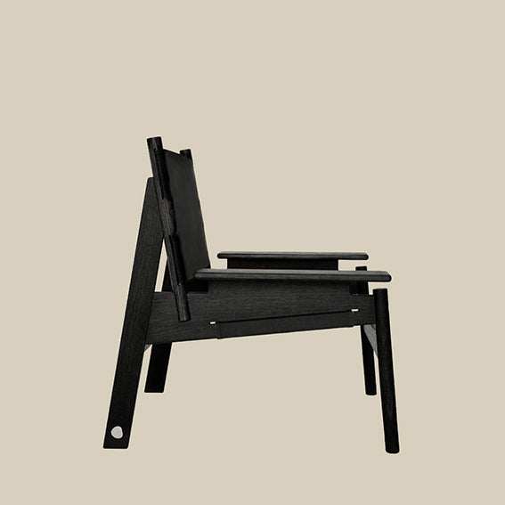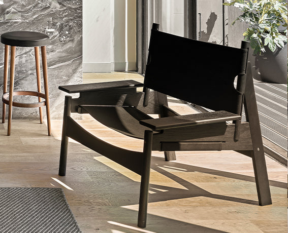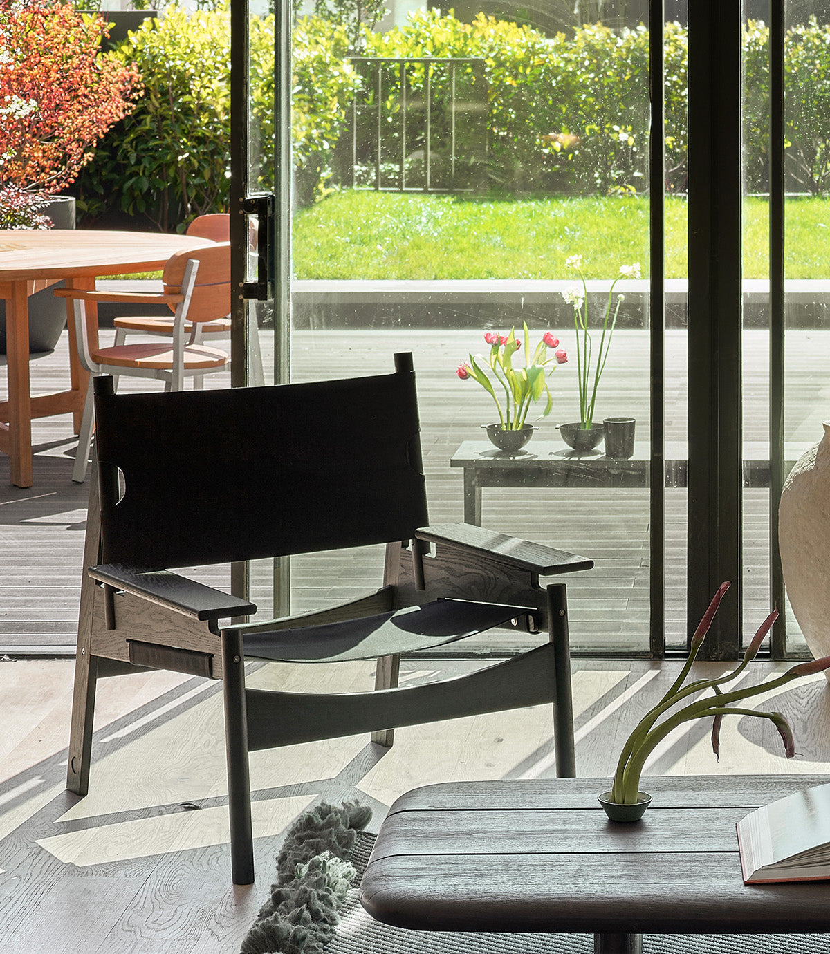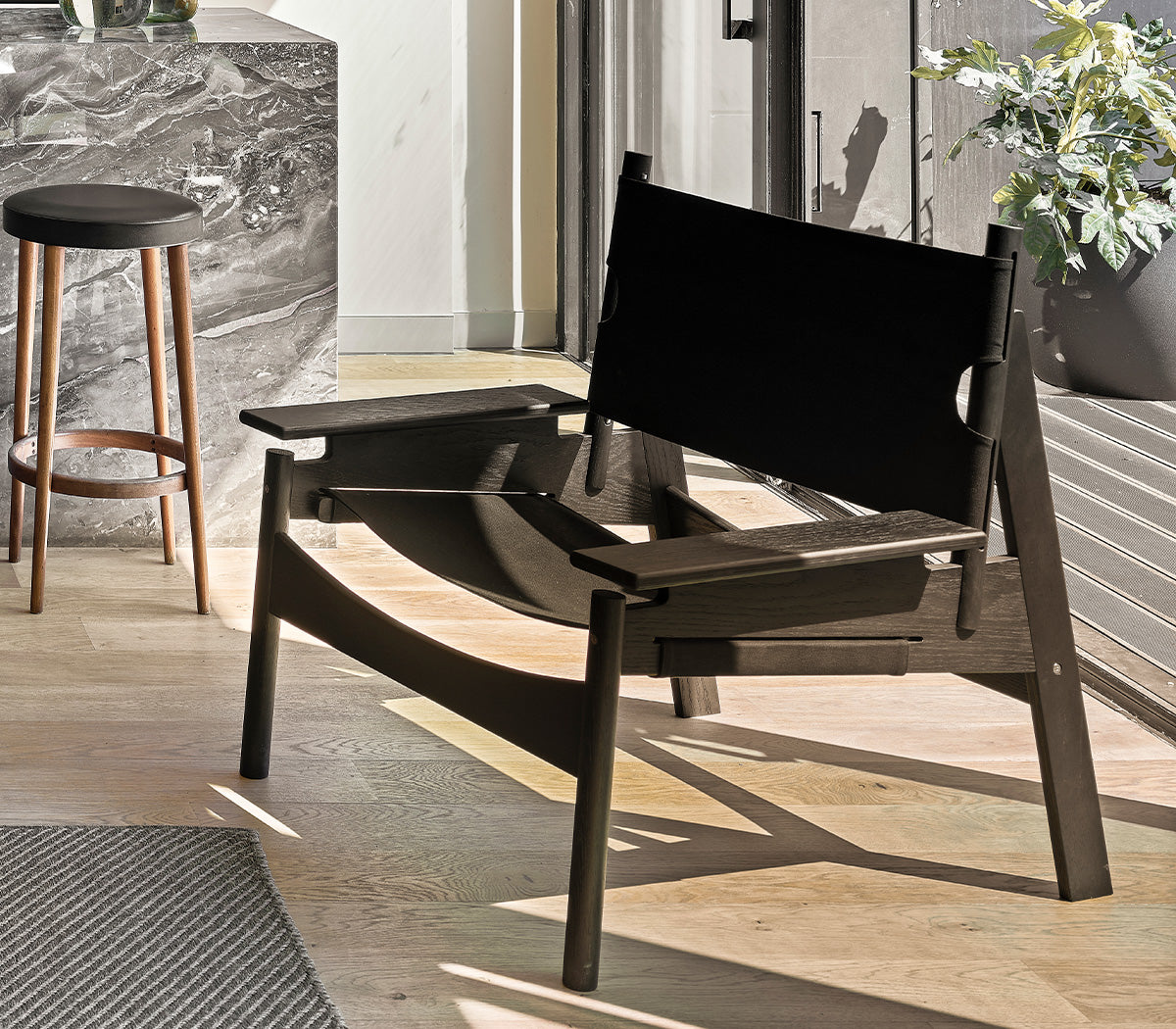 Frame Lounge Chair makes the sculptural relationship of the parts visible. The warm canvas fabrics of the seat and backrest surround the wooden skeleton with clever details.