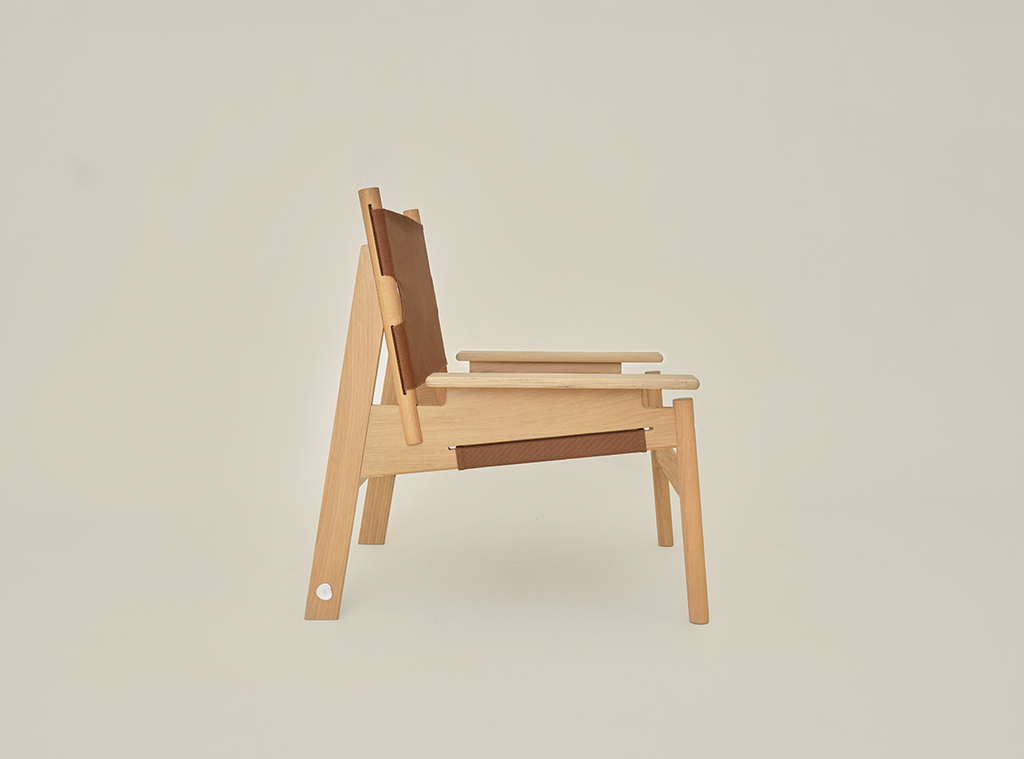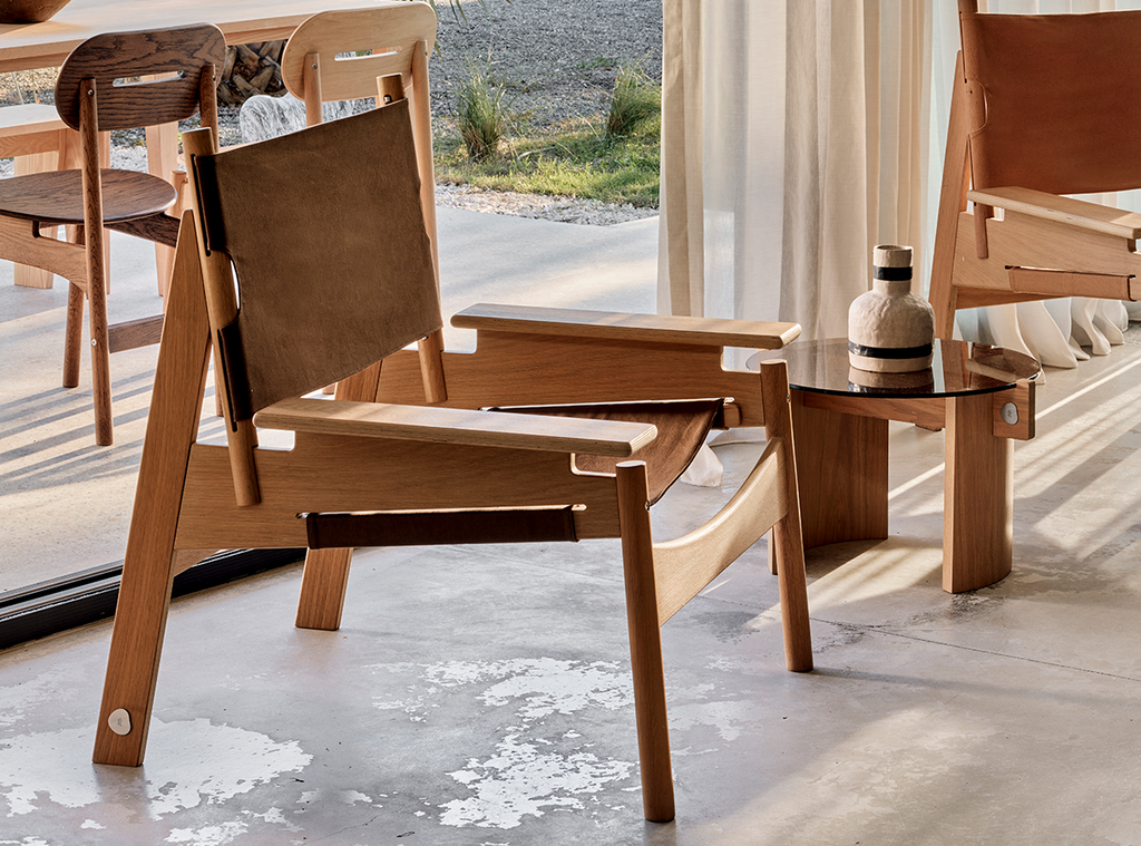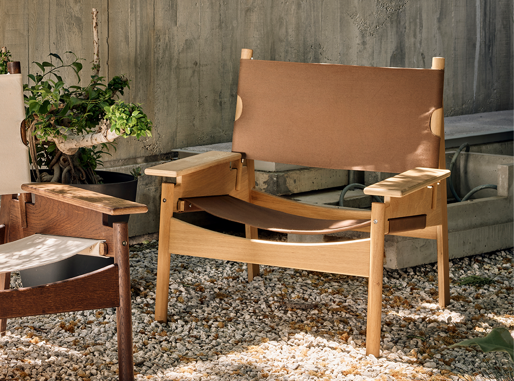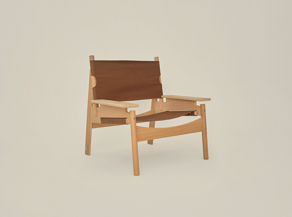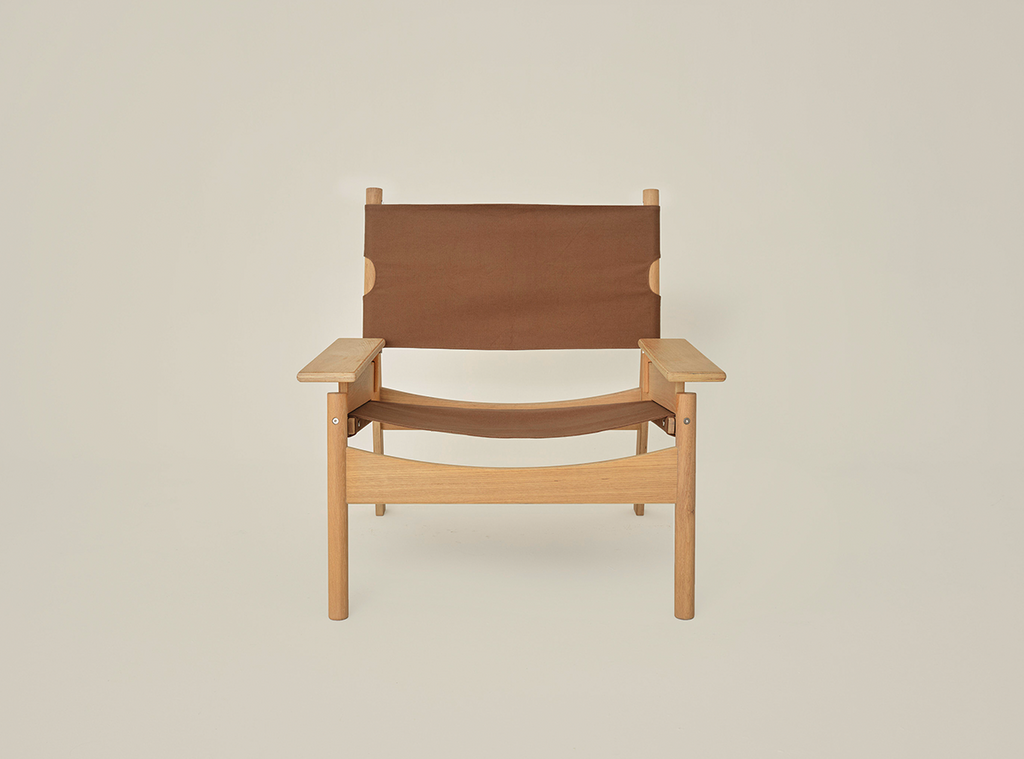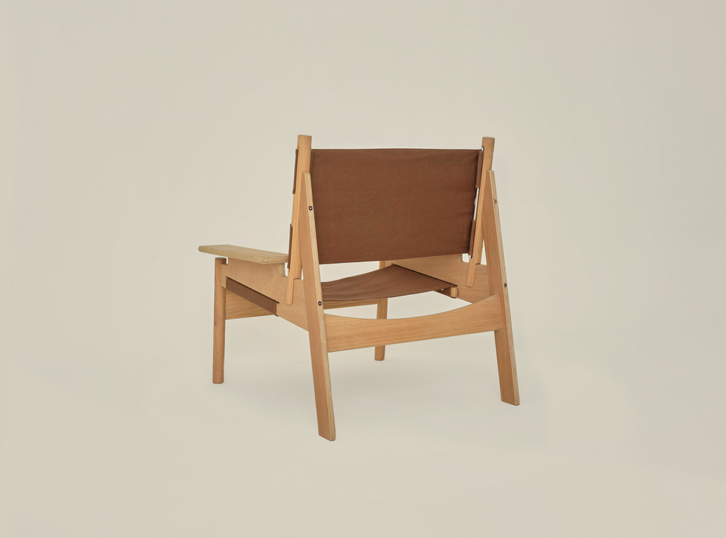 Frame Lounge Chair makes the sculptural relationship of the parts visible. The warm canvas fabrics of the seat and backrest surround the wooden skeleton with clever details.