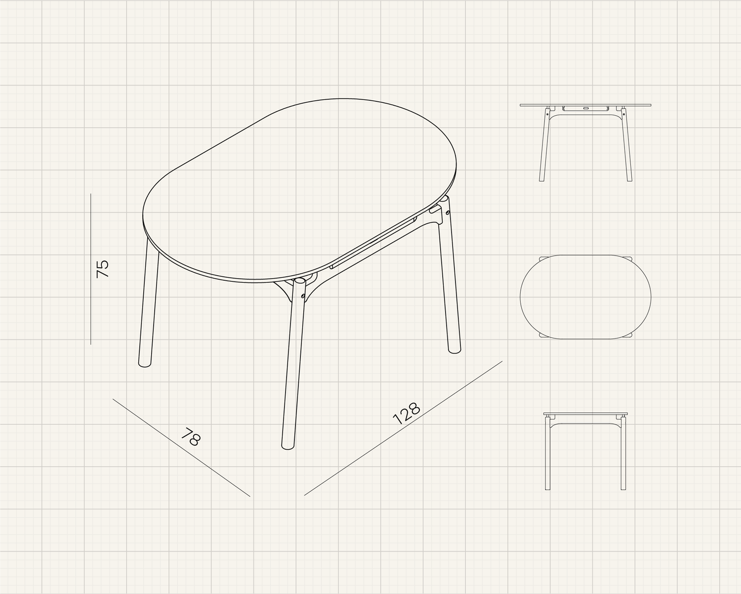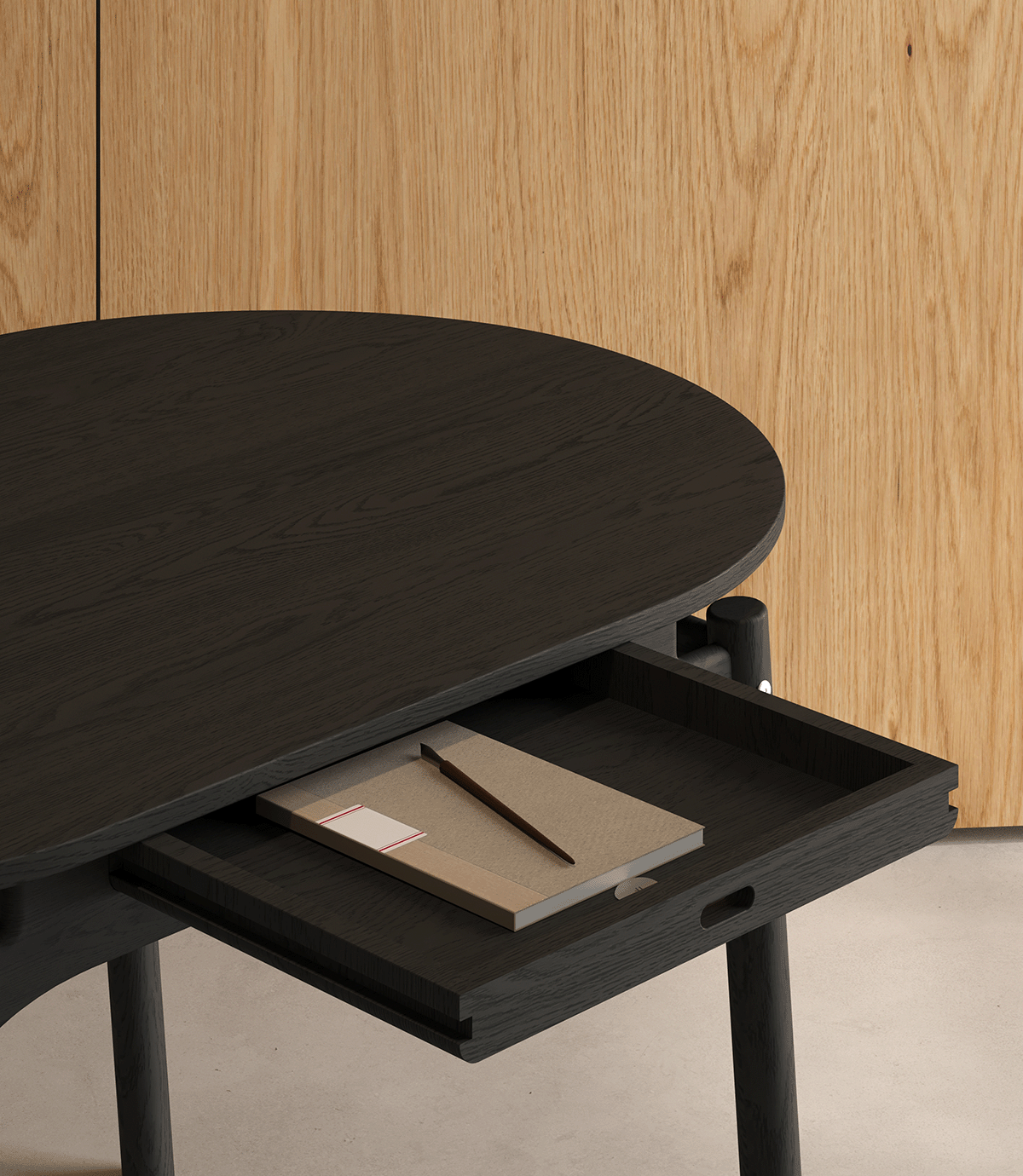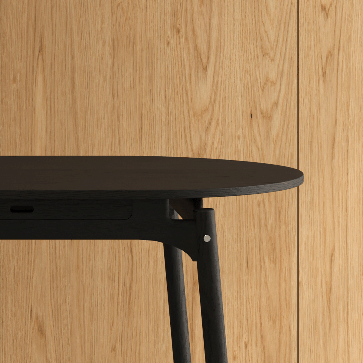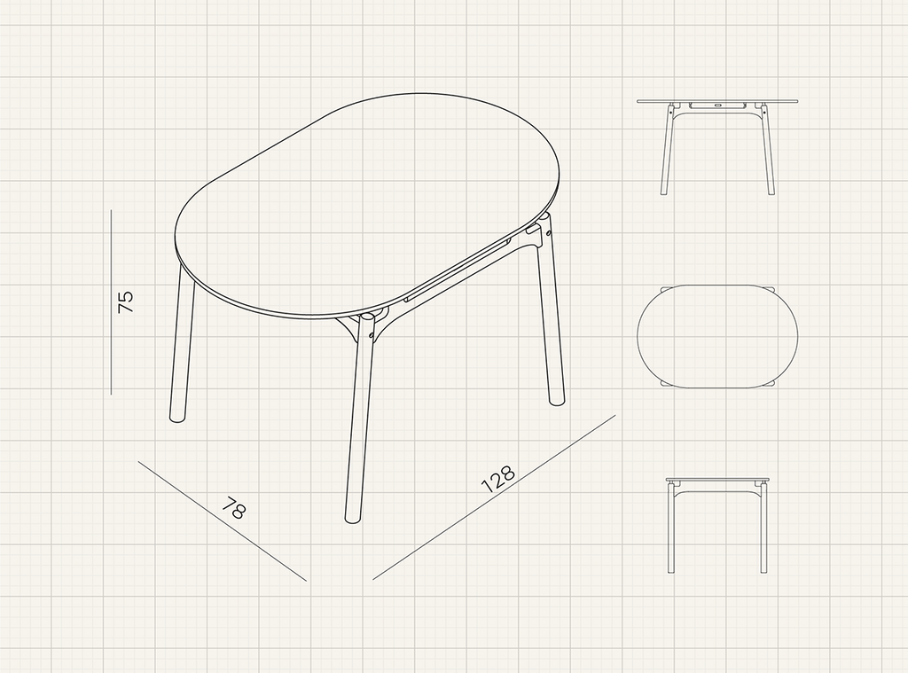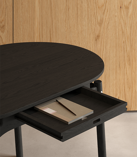It is a spacious yet lightweight piece. Crafted from oak wood, it defines a sculptural structure with solid round legs and an elliptical table top. Frame Table is flatpack; the parts join each other easily with screws and no need for glue.