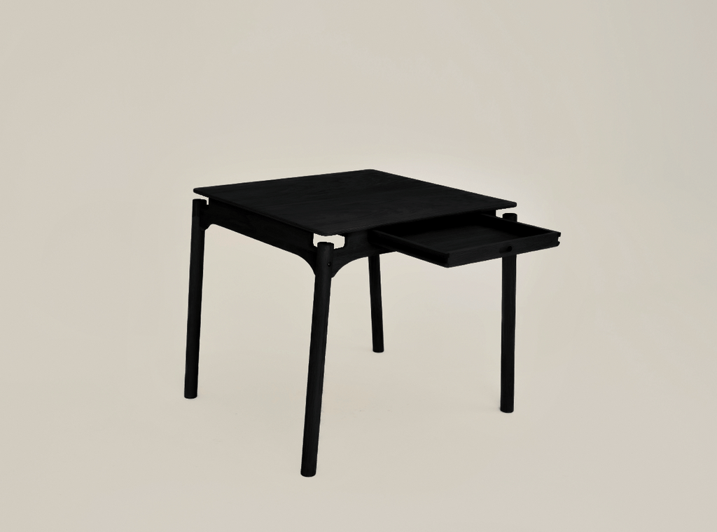 The poetic relationship between sophisticated structure and square table top characterizes its presence with an elegant drawer.