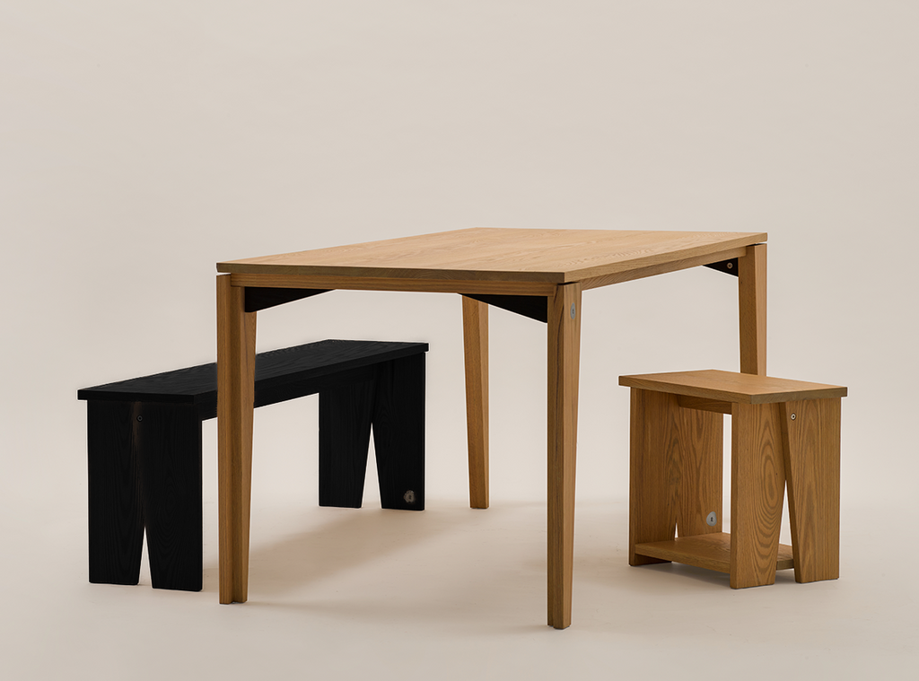 Wa Bench is flatpack; the parts join each other easily with screws and no need for glue. The wooden pieces are obtained from sustainable forests and coated with water-based charcoal black wood stain to add a bold statement to interiors.